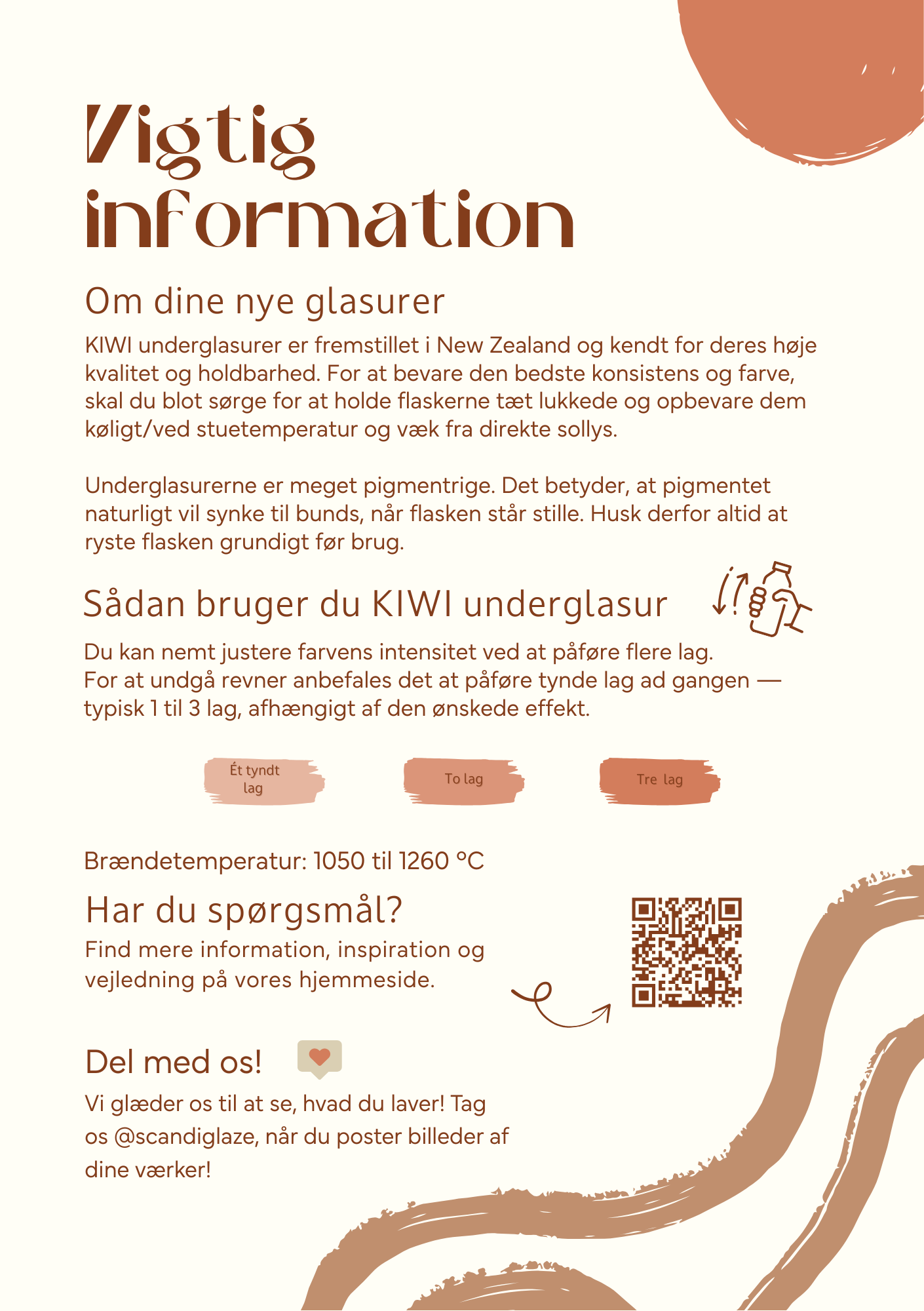 Vores KIWI underglasurer er en palette med levende, mættede farver, baseret på pulveriserede keramiske farvepigmenter. Glasurerne er flydende og leveres i praktiske flasker, som er nemme at hælde af. De er velegnede til påføring direkte på ubrændt eller forglødet ler og fungerer godt ved både stentøjs- og lertøjstemperaturer.