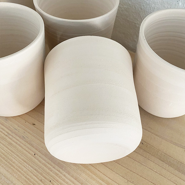 Fordel ler i formen og tryk godt ud så leret fordeler sig lige i hele formen. Varm en smule på leret med en hårtørrer/varmeblæser og når leret trækker sig en smule kan du få din kop ud og arbejde videre.